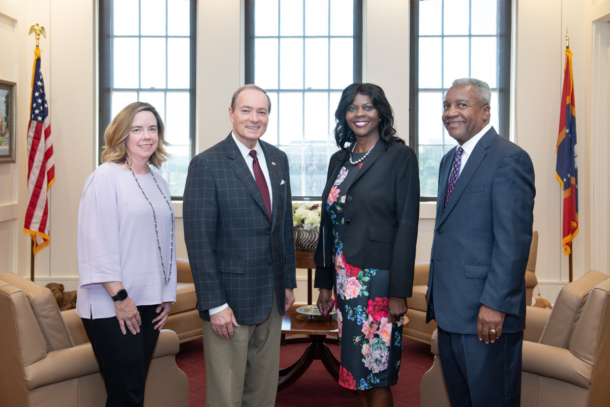 Mississippi State President Mark E. Keenum (second from left) recently welcomed prominent members of the U.S. Department of Agriculture to the Starkville campus for discussions about collaboration and research opportunities. Pictured are Chavonda Jacobs-Young, USDA Undersecretary of Agriculture for Research, Education and Economics (second from right); Sharon Drumm, Chief of Staff (left); and Archie Tucker, USDA Southeast Associate Area Director.