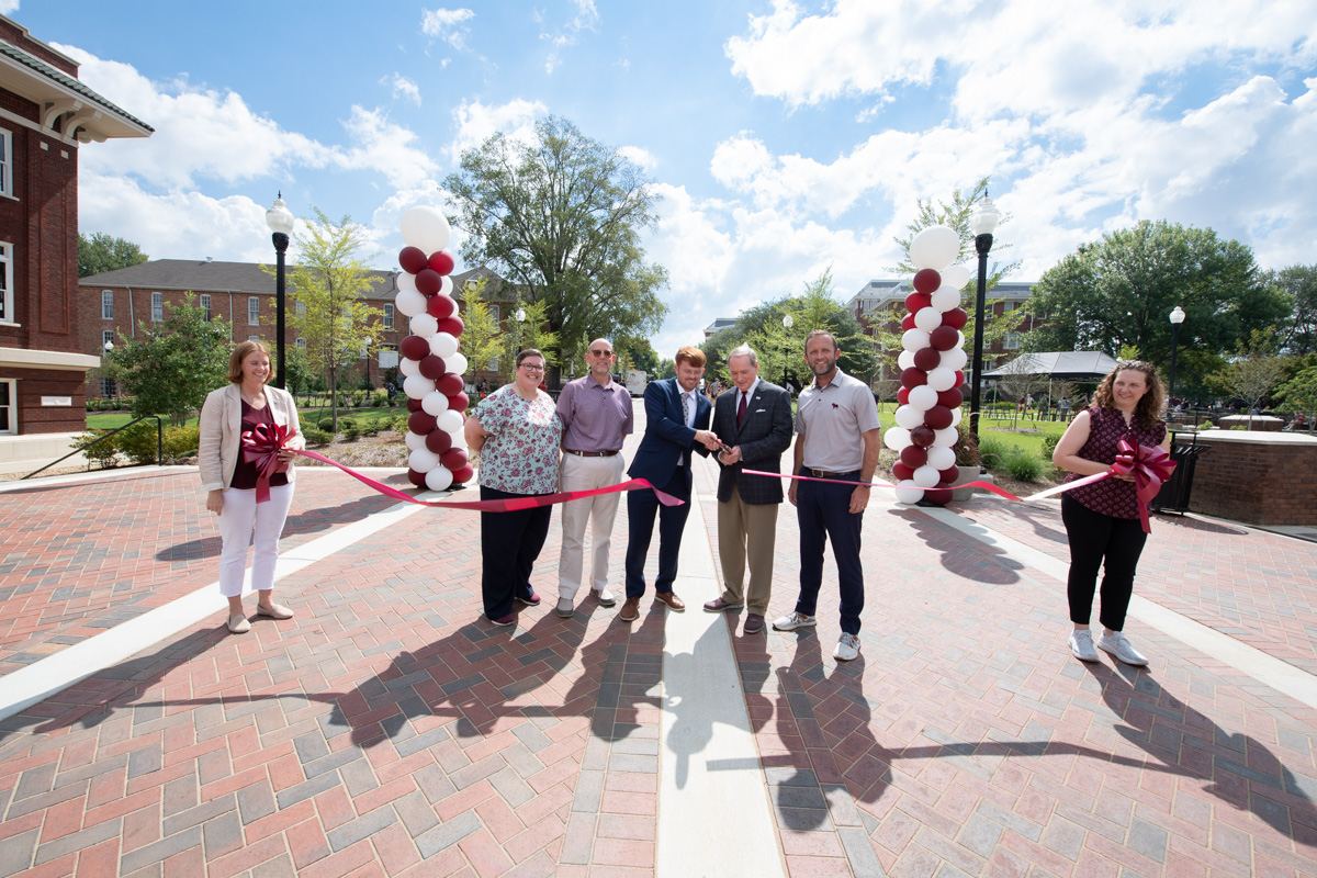 Kennedy Guest, president of the MSU Student Association, and President Mark E. Keenum cut the ribbon to celebrate the official opening of the new plaza between the YMCA Building and Colvard Student Union last Friday [Aug. 19]. Additional MSU officials joining them included (from left) Regina Hyatt, vice president for student affairs; Don Zant, vice president for finance and administration and CFO; Guest; Keenum; and Saunders Ramsey, executive director of Campus Services. Festivities also included a block party on the pedestrian-friendly plaza with food trucks and entertainment.