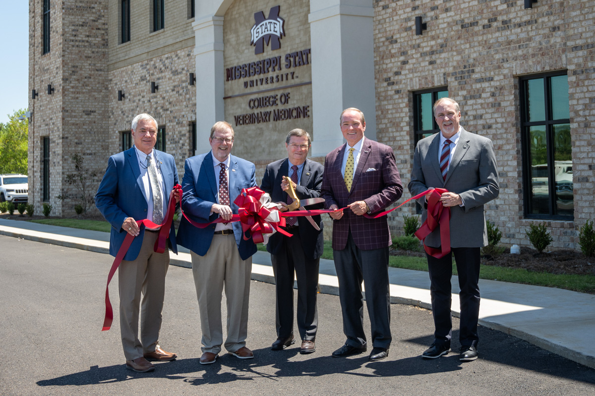 Celebrating a ribbon-cutting ceremony Aug. 17 for the MSU College of Veterinary Medicine’s newly renovated and expanded Animal Emergency & Referral Center are, from left to right, Assistant Dean for Clinical Services Joey Burt, Vice President for the Division of Agriculture, Forestry and Veterinary Medicine Keith Coble, retiring CVM Dean Kent Hoblet, MSU President Mark E. Keenum and Associate Dean Ron McLaughlin. Located in Flowood, the AERC now offers 4,929 square feet of renovated space along with a 14,156-square-foot addition to the previous facility.