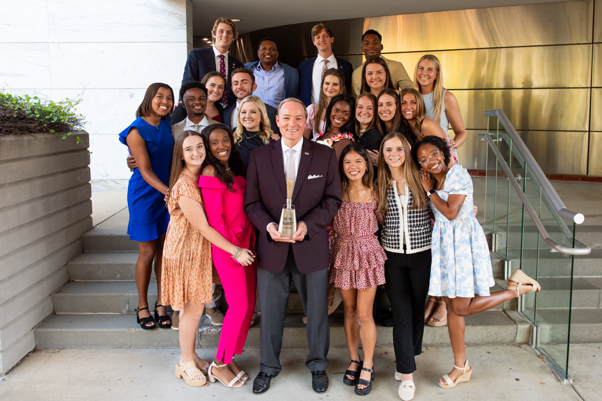 MSU President Mark E. Keenum joins in celebrating the 2023 class of Orientation Leaders at Hunter Henry Center during a fall evening of fellowship and accolades. As a “thank you” for Keenum’s support, the OL team gifted him with a special personalized cowbell inscribed with his iconic phrase, “Go to Class!”