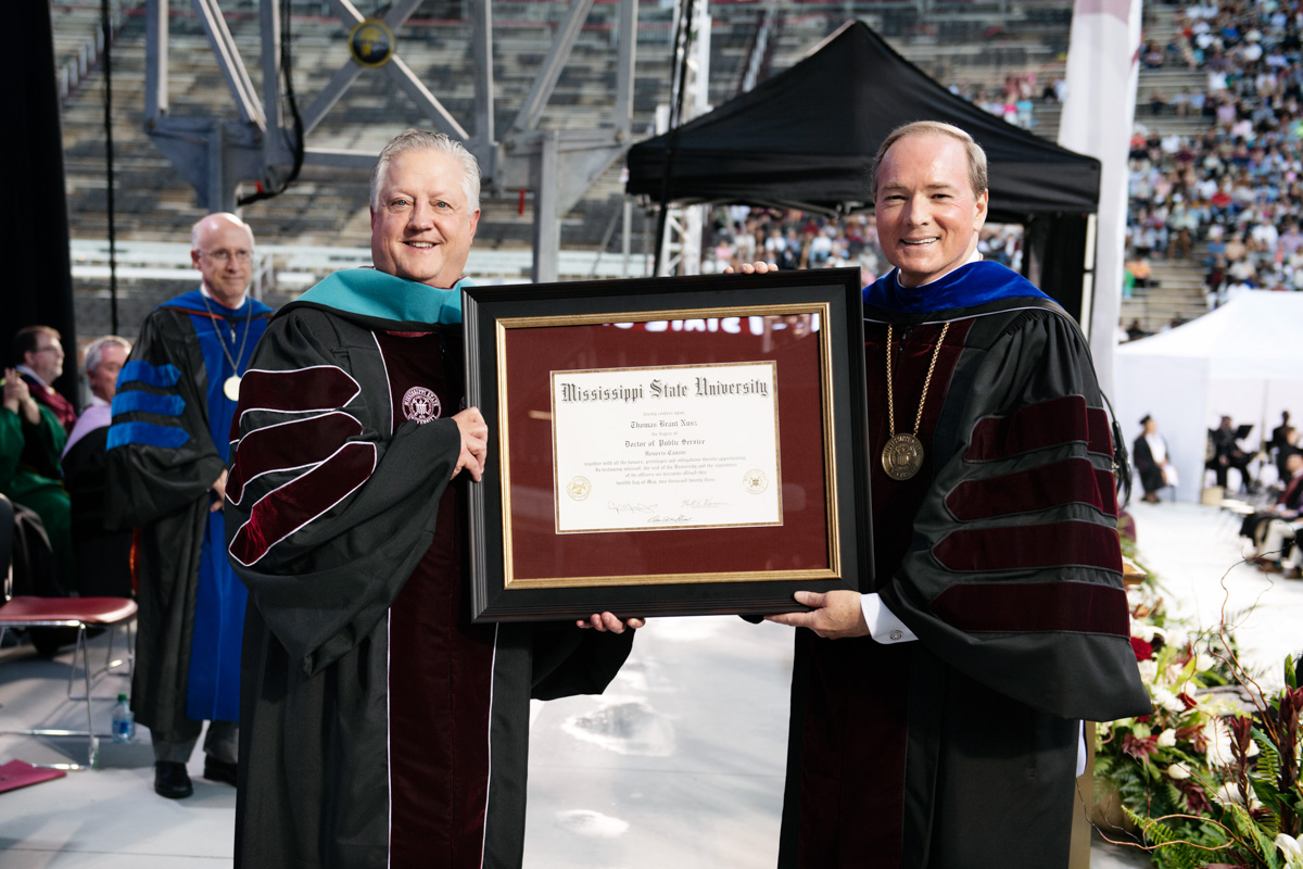 MSU President Mark E. Keenum presents Tommy B. “Tommy” Nusz of Houston, Texas, with an honorary Doctor of Public Service degree during the evening MSU commencement ceremony on Friday May 12.