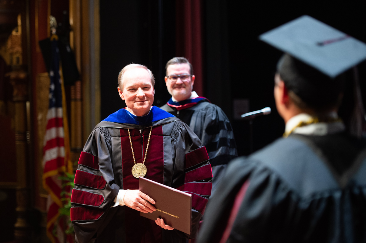 Mississippi State President Mark E. Keenum smiles with pride as a student participating in MSU-Meridian’s spring commencement ceremony crosses the stage.