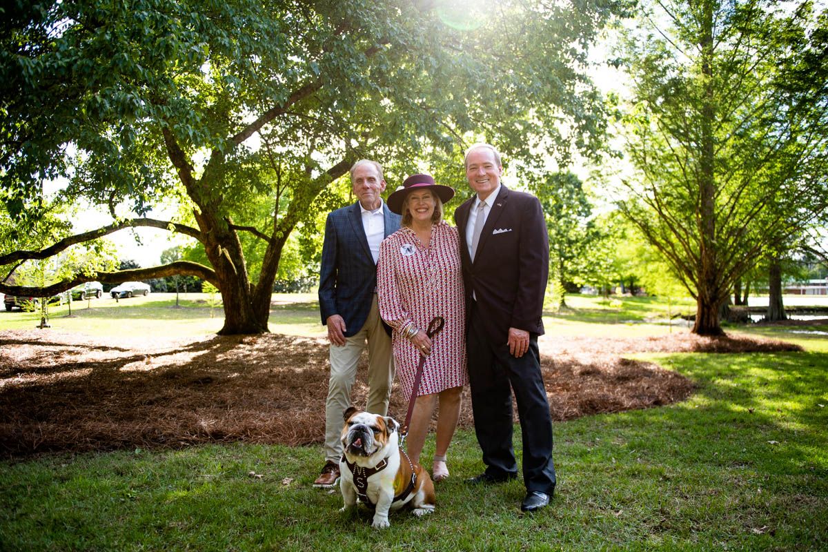 MSU President Mark E. Keenum smiles with ‘Dak’ (Bully XXII) and his owners, Bruce and Julie Martin of Meridian, at an official welcome celebration kicking off Super Bulldog Weekend 2023. The Martins, who are longtime, generous supporters of MSU, are proud to be the lucky dog’s family.