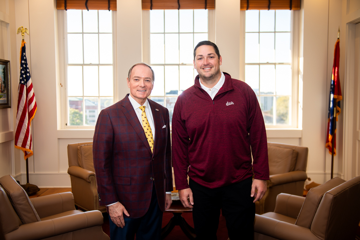 MSU’s new Head Football Coach Jeff Lebby arrived in Starkville in November to a welcome from university President Mark E. Keenum. Noted as an "offensive mastermind," Lebby is the program's 36th head coach and joins MSU from the University of Oklahoma following a successful stint as the Sooners' offensive coordinator.
