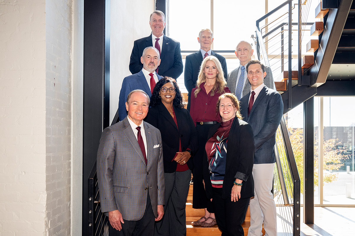 The Mississippi State University Alumni Association honored the 2024 Alumni Fellows during a campus visit spanning three days in October. These alumni offered current MSU students invaluable professional insights before the distinguished Bulldogs were recognized during the MSU vs. Arkansas football game. Pictured are front row, left to right, MSU President Mark E. Keenum and honorees Lea Ann Macknally, College of Agriculture and Life Sciences; second row, Dr. Katrina Poe-Johnson, College of Arts and Sciences; third row, Jimmy Taylor, College of Forest Resources; Dr. Mirae Cade Wood, College of Veterinary Medicine; Johnny L. “Ty” Crane III, College of Architecture, Art and Design; and fourth row, James M. Robinson, College of Business; Ronnie Allen Martin, Bagley College of Engineering; and John Duke Passons, College of Education.