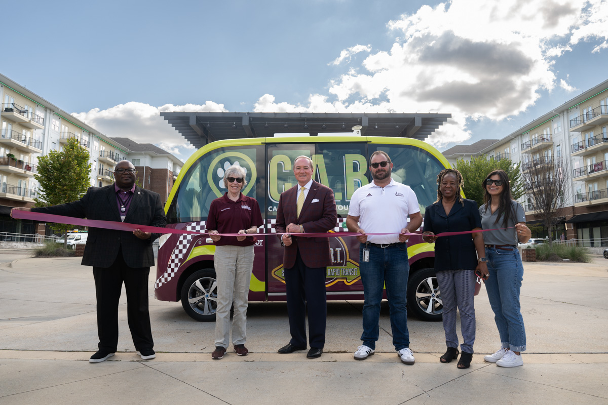 Representatives of Mississippi State, Starkville, the Mississippi Department of Transportation and Beep Inc. welcomed two electric-autonomous shuttles to the university campus in mid September with a ribbon cutting. The first such shuttles in the SEC and Mississippii will transport university and local community riders between the campus core, key housing locations and popular entertainment destinations. Pictured are, from left, Roderick Bailey, MDOT public transit deputy director; Lynn Spruill, Starkville mayor; Mark E. Keenum, MSU president; Jeremiah Dumas, MSU executive director of transportation; Shirley Wilson, MDOT public transit director; and Bri Kimmel, Beep, Inc. client success manager.