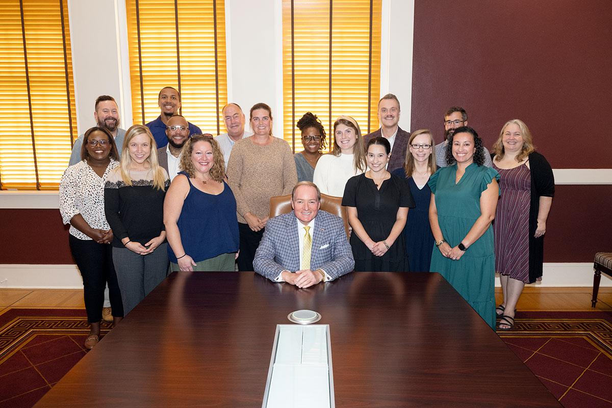 Doctoral students in the Organization and Governance of Higher Education fall semester course met in September with MSU President Mark E. Keenum, seated, who shared his perspectives on leading the university. Higher Education Leadership Graduate Program Coordinator Danielle Molina, back right, leads the College of Education course in which students explore the structure, culture and dynamics of contemporary universities and the various leadership roles in these institutions.