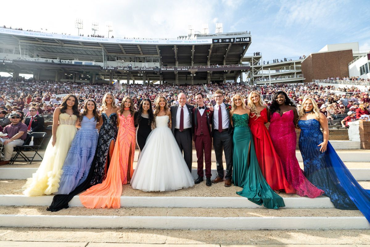Mississippi State President Mark E. Keenum, center, congratulated the 2024 Homecoming Court on the sidelines during the Bulldogs game against UMass in early November. This year’s homecoming week, with the theme “Showtime: MSU in the Spotlight,” featured many activities including the annual Family Weekend, a T-shirt swap, Breakfast with Bully, Step Show, tours and a 45-20 victory over the Minutemen.