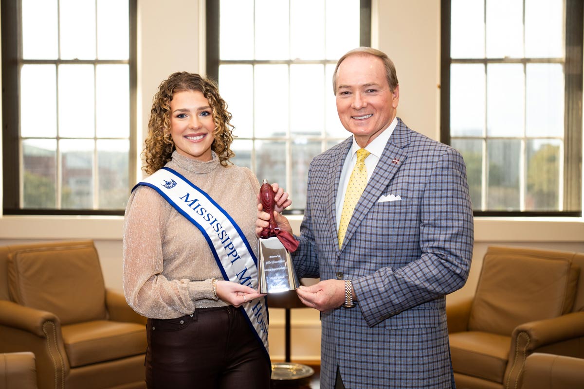 Chloe Weeks of Louisville, visited with MSU President Mark E. Keenum in December after several months of touring and engagements as Mississippi’s Miss Hospitality 2024. An MSU senior psychology major, she will spend the next year promoting Mississippi’s tourism and economic development industries across the state and country as the state’s official Goodwill Ambassador.