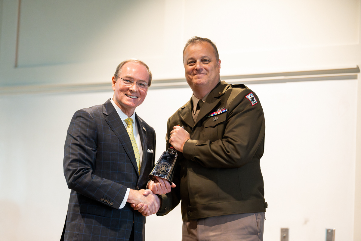 MSU alumnus Andrew Rendon, the university’s executive director for Veterans and Military Affairs, is presented a chrome cowbell by MSU President Mark E. Keenum during a July ceremony in which Rendon is elevated from colonel to brigadier general in the Mississippi National Guard. Less than one-half of 1% of officers in the Army achieve the rank of a general officer.
