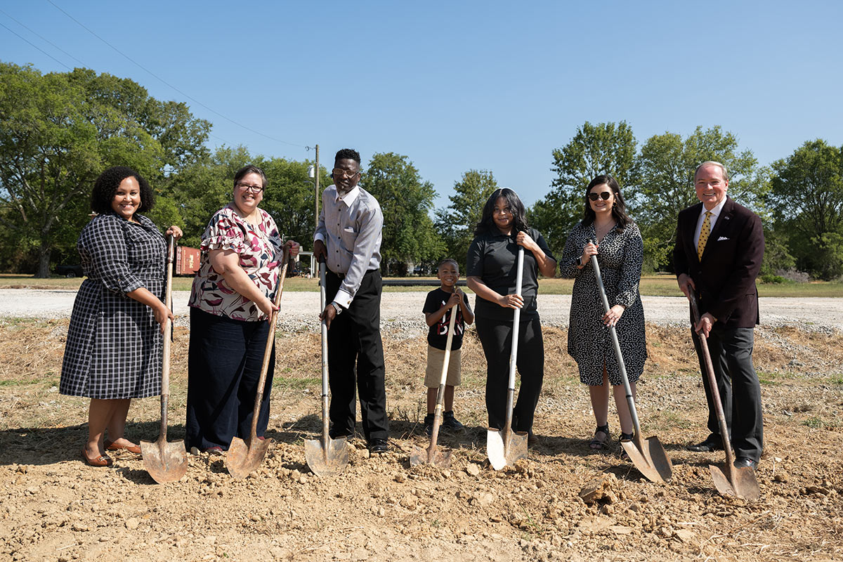MSU and Starkville Habitat for Humanity representatives, community members and student volunteers gathered in August in rural Oktibbeha County to break ground on the 16th Maroon Edition Habitat home. From left are MSU Director of Student Leadership and Community Engagement Kathy Jones; MSU Vice President for Student Affairs Regina Hyatt; Pastor Willie Edwards; Habitat home recipients Khalil and Chiquita Brown; Starkville Habitat Board President Alyssa McKinley; and MSU President Mark E. Keenum.
