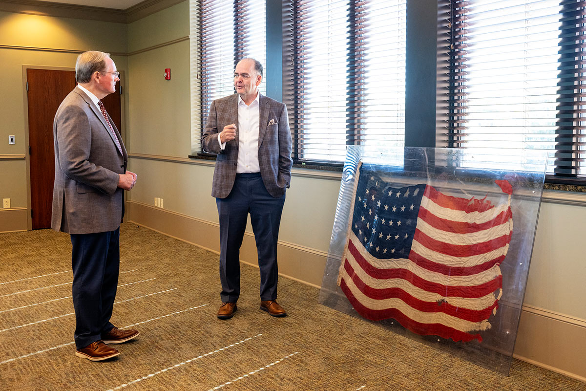 In October, MSU President Mark E. Keenum and the university’s U.S. Grant Presidential Library received a piece of history—a U.S. flag believed to have been part of the 18th president’s funeral procession on Aug. 8, 1885, in New York City. Starkville’s Renasant Bank and its President of Wealth Management Rocky Miskelly, right, gifted Keenum the relic, which supposedly made its way to Mississippi through a Union officer’s family and was displayed for decades in the historic Eola Hotel in Natchez.