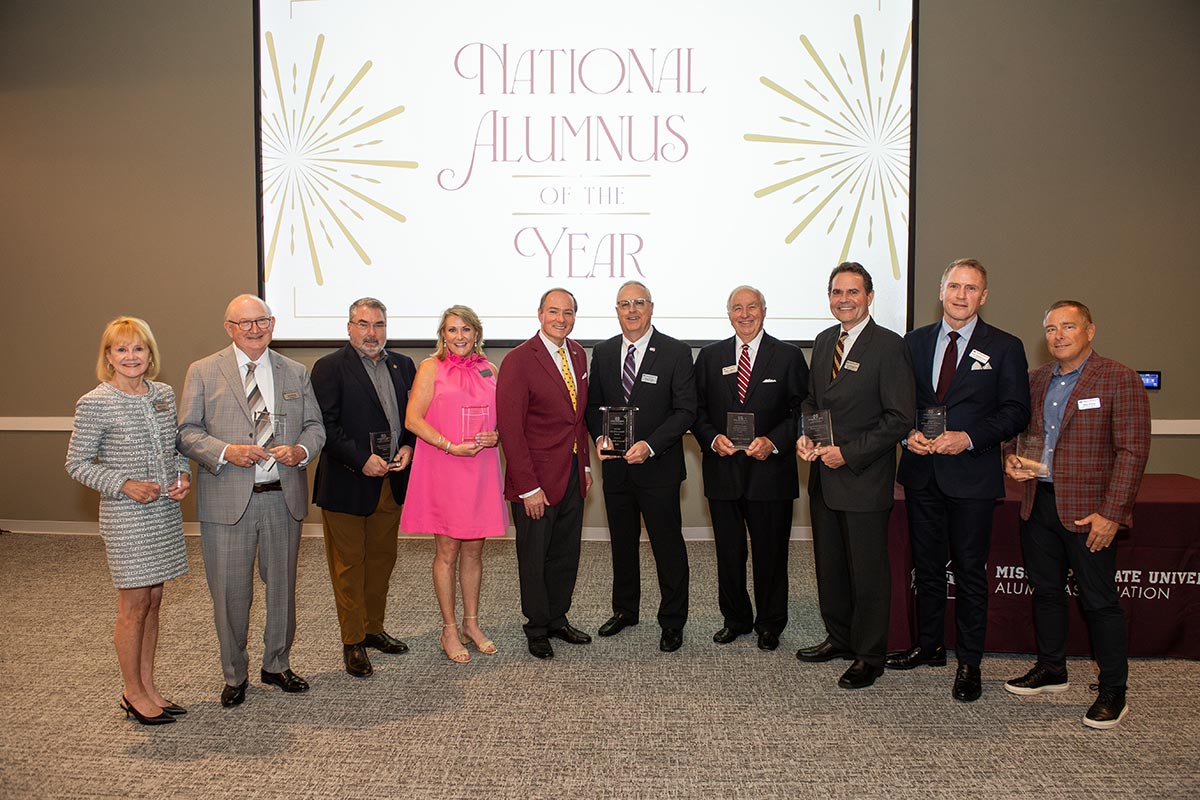 Mississippi State University recognized Bryan Wilson, center, as its National Alumnus of the Year during the May Alumni Association 2024 Awards Banquet. MSU President Mark E. Keenum, left of Wilson, congratulated the two-time Bulldog graduate, along with an outstanding graduate from each of MSU’s eight academic colleges.