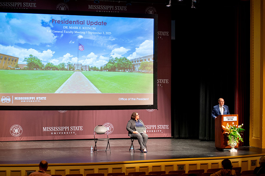 MSU President Mark E. Keenum addressed faculty and staff in September during the university’s Fall General Faculty Meeting, highlighting record-breaking achievements, campus growth and continued momentum. He praised MSU’s numerous supporters for investing in the university’s mission. “They are all in on Mississippi State University,” he said.