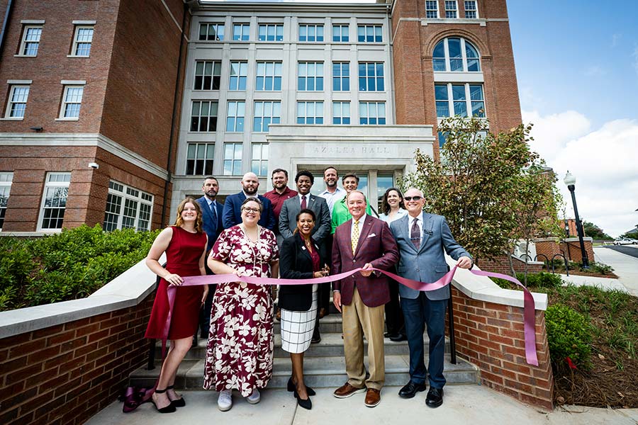 Celebrating an August ribbon cutting ceremony for Azalea Hall, MSU’s newest and largest student residence hall, were, front row from left: Residence Hall Association President Julia Bryant, Vice President for Student Affairs Regina Hyatt, Executive Director of Housing and Residence Life Dei Allard, MSU President Mark E. Keenum, and Luckyday Foundation Chair Jamie Houston; back row: MSU Dining Services Resident District Manager James Jankowski, HPM Project Manager P.J. Pearson; MSU Director of Planning for Design and Construction Administration Ches Fedric; Student Association President Cameron Cummings; Executive Director of MSU Campus Services Saunders Ramsey, Wier Boerner Allin Architecture Principal and Senior Project Architect Jule Markle, and Mackey Mitchell Architects Lead Designer Gwynn Zivic.