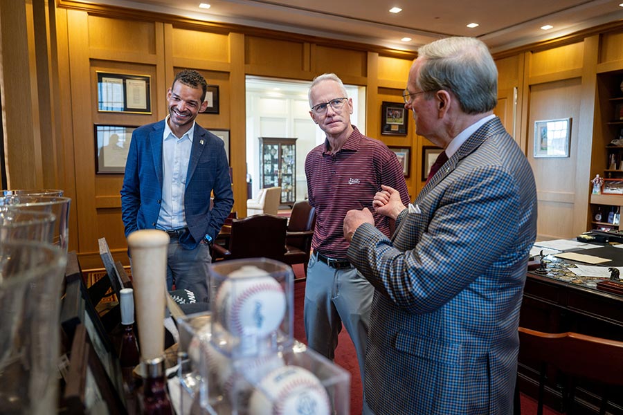 As Mississippi State welcomed new Bulldog Baseball Coach Brian O’Connor, center, to campus in early June, MSU Mark E. Keenum, right, discussed the proud legacy of the sport at the university and showed him many memorabilia items in his office. MSU Athletic Director Zac Selmon, left, gave O’Connor his first tour of campus, with their first stop in Allen Hall to meet with Keenum.