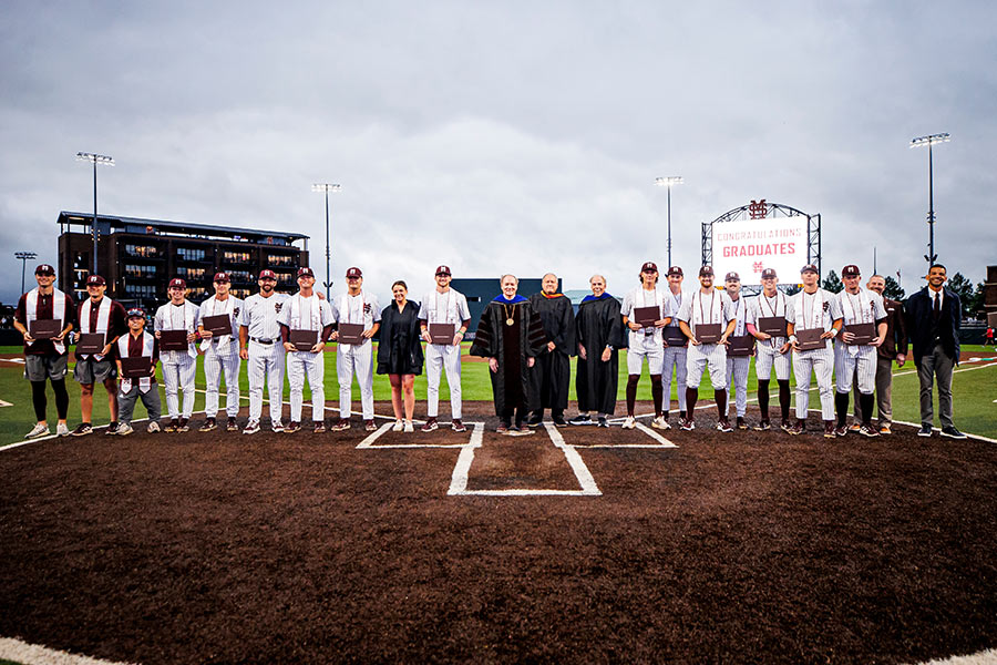 Bulldog baseball seniors were honored with a spring graduation ceremony at Dudy-Noble Field before kicking off a weekend series with Ole Miss. MSU President Mark E. Keenum, center, was present to personally hand each student-athlete their diploma and thank them for making the most of their time in the classroom and on the field.