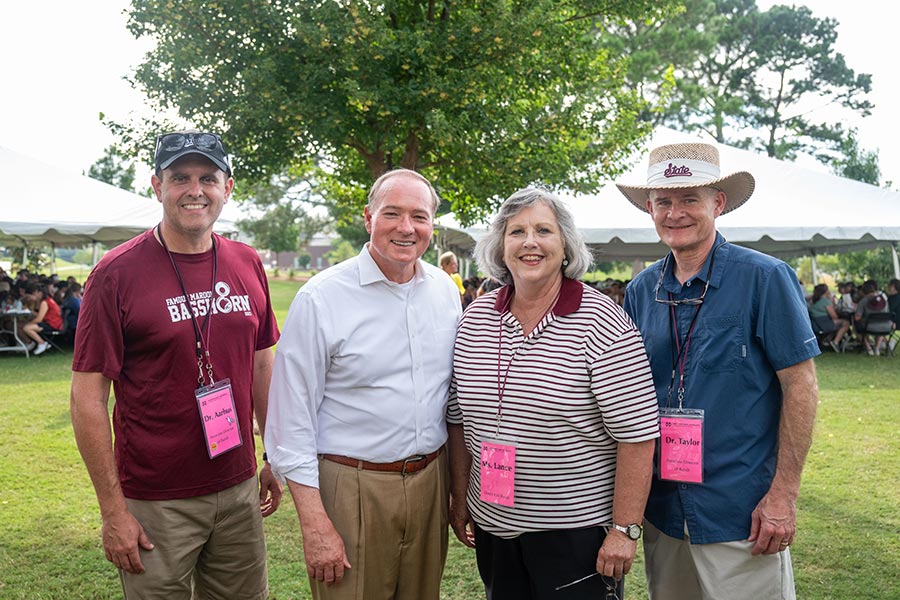 A welcome-back dinner was held for the MSU Famous Maroon Band at the home of President and Mrs. Mark E. Keenum in mid August as members were beginning their practice sessions ahead of football season. Shown, from left, are Associate Director of Bands Craig Aarhus, MSU President Mark E. Keenum, Director of Bands Elva Kaye Lance and Associate Director of Bands Cliff Taylor.