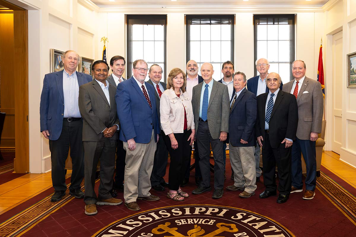 President Mark E. Keenum, right, hosted William L. Giles Distinguished Professors, from left, Alan Marcus, Raja Reddy, Mark Lawrence, Keith Coble, Mark Novotny, Jan Chambers, Daniel Peterson, Merrill Warkentin, Wes Schilling, Wes Burger, Richard Brown and Mohsen Razzaghi for an annual luncheon in late April. The Giles honorary distinction is based on distinguished scholarship as evidenced by a record of outstanding research, teaching and service and is conferred only on a faculty member who has attained national or international status. The professorships are named for William L. Giles, the university's 13th president, who served from 1966 to 1976.