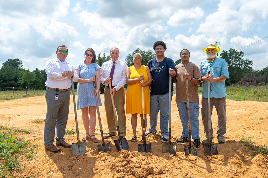 Mississippi State officials, Starkville Habitat for Humanity representatives, community members and student volunteers gathered in rural Oktibbeha County in August to break ground on the 17th Maroon Edition Habitat home. Participating, from left, were Habitat Board of Directors President Austin Check, Starkville Habitat Executive Director Amanda Henry, MSU President Mark E. Keenum, Habitat home recipients Danyell Latham and her sons Kasen and Robert, and Starkville Habitat construction manager John Breazeale.