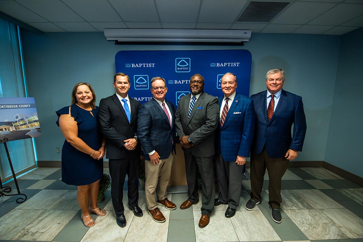 MSU President Mark E. Keenum, second from right, joined in celebrating Baptist Memorial Health Care’s purchase of OCH Regional Medical Center and the future of healthcare in Oktibbeha County. Pictured during the October event were, from left, Lauri Sansing, Chief Nursing Officer, Baptist Memorial Hospital-Oktibbeha County; Mac Flynt, Administrator and CEO, Baptist Memorial Hospital-Oktibbeha County; Jason Little, President and CEO, Baptist Memorial Health Care; Marvell Howard, President, Oktibbeha County Board of Supervisors; Keenum; and Robby Gathings, Baptist Memorial Health Care Corporate Board of Directors member.
