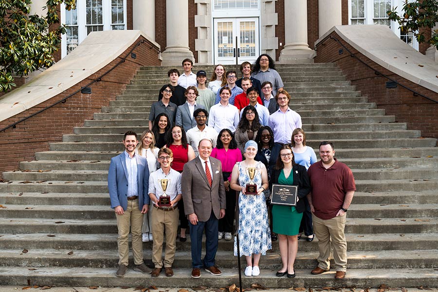 Mississippi State University Debate Team became a back-to-back national collegiate champion after winning top honors at the spring 2025 International Public Debate Association National Tournament. MSU President Mark E. Keenum, center front, congratulated the group on its consecutive wins from the largest intercollegiate debating association in the U.S. Each year, more than 200 colleges and universities from across the country compete in IPDA tournaments.