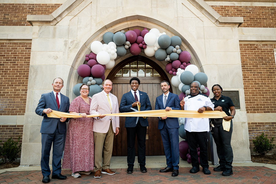 After a year of renovations, a beloved campus landmark, Perry Cafeteria, reopened as Perry Food Hall. A new dining destination honoring the past and focused on the next generation of Bulldogs, it honors its storied past while serving the next generation of Bulldogs. Taking part in the August ribbon cutting were, from left, Aramark Vice President for Collegiate Hospitality Alisdair MacLean; MSU Vice President for Student Affairs Regina Hyatt; MSU President Mark E. Keenum; Student Association President Cameron Cummings; Resident District Manager for MSU Dining Services James Jankowski; Chef Dominic Towe; and Starbucks Manager Santana Jones.