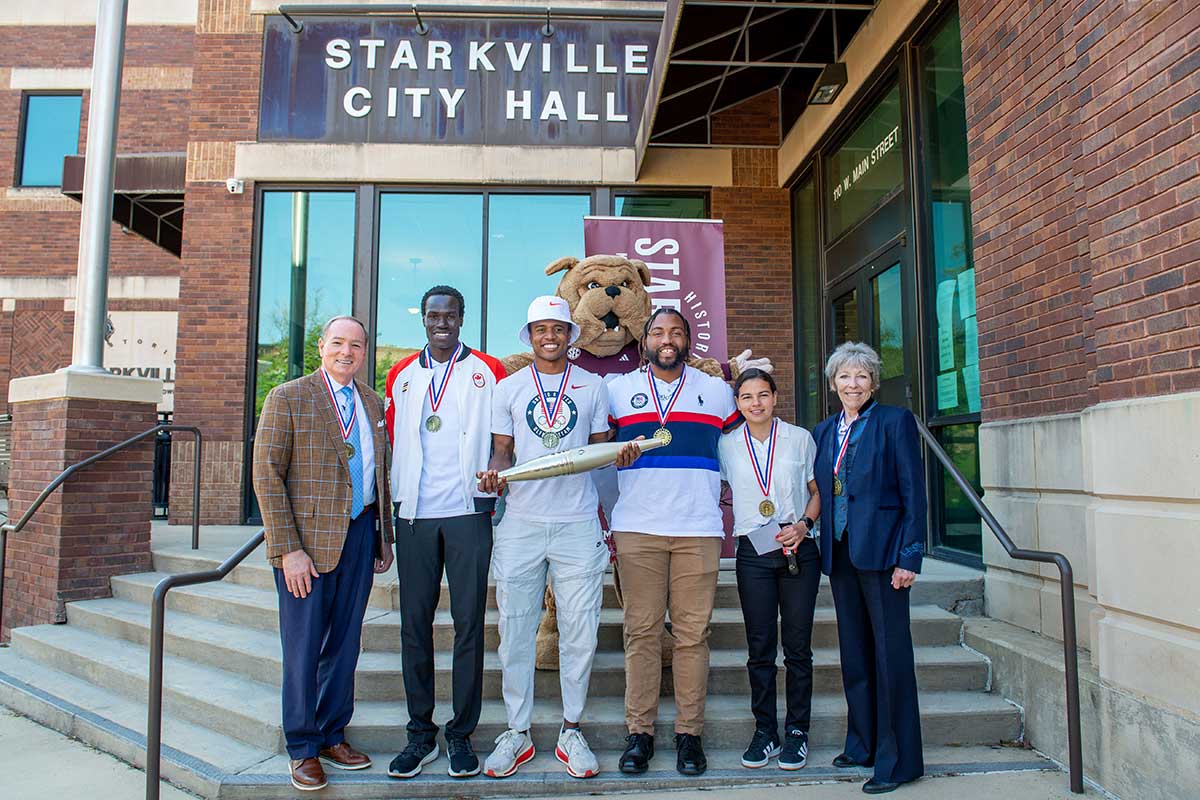 Mississippi State and the city of Starkville in April celebrated receiving an authentic Olympic torch used in the 2024 Olympics in Paris. MSU President Mark E. Keenum, left, and Starkville Mayor Lynn Spruill, right, also were presented an Olympic medallion and plaque for their dedication to displaying the historic keepsake, a symbol of unity which MSU and Starkville share through their successful town-and-gown relationship. Additionally, four Olympians received the medallion: MSU’s Marco Arop; Isaiah Jewett who trains with Arop; and MSU’s Curtis Thompson and Ilana Izquierdo. After making a full state tour, the torch will be available for viewing in Starkville’s City Hall for one year. The event was made possible by Coca-Cola and local distributor Clark Beverage Company, a longtime university supporter.