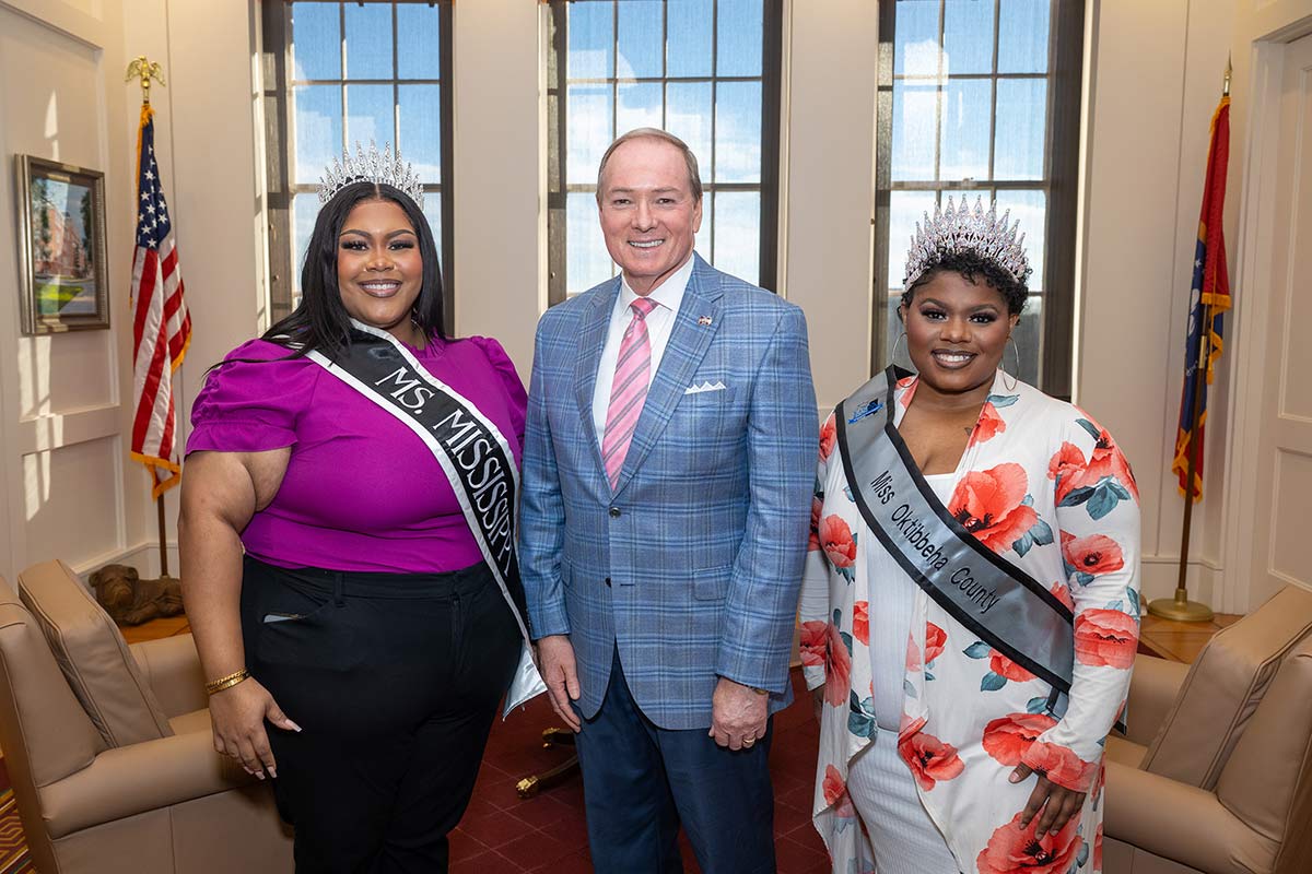 MSU President Mark E. Keenum visited with Miss Mississippi Plus America and MSU graduate student Halle Mims, left, and Miss Oktibbeha County Plus America Tanisha Brown during the first week of March. He also presented them with cowbells and introduced Brown to the university tradition of being given her very first cowbell.