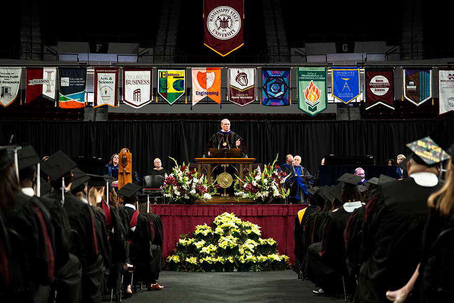 Led by MSU President Mark E. Keenum, December commencement ceremonies in Humphrey Coliseum spotlighted more than 1,500 graduates in majors housed in MSU’s 10 colleges and the Division of Academic Affairs. A Starkville hooding for doctoral recipients and MSU-Meridian’s overall graduation at the Riley Center were held during the same week. Keenum reminded of them that “you’re about to receive a diploma that says ‘Mississippi State’ on it. People will see that name and know you are part of a wonderful family. That’s why your diploma is so valued—because of who we are.”