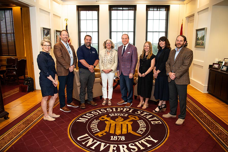 Mississippi Department of Archives and History representatives visited in mid June with MSU President Mark E. Keenum, center, to discuss the field school partnership the state agency and university have at Historic Jefferson College in Adams County. The program gives students in MSU’s historic preservation graduate program hands-on learning millwork experiences with doors, windows, moldings and mantles as MDAH rehabilitates the site’s eight buildings for use as an interpretive center and permanent preservation field school. Pictured are, from left, Angi Bourgeois, MSU College of Architecture, Art and Design dean; and MDAH’s Tommy Goodwin and Robert Benson, deputy directors; Meredith Massey, historic preservation deputy director; Molly West, agency consultant; and Barry White, historic preservation director.