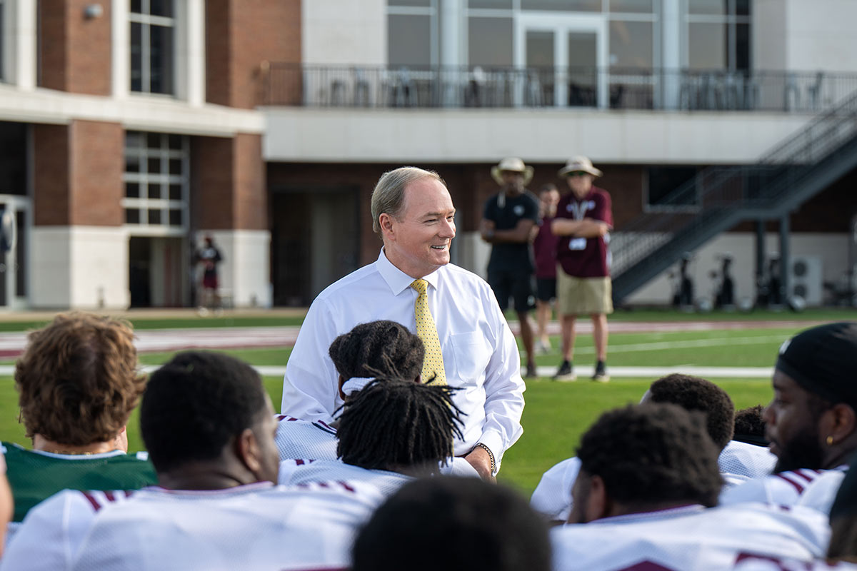 MSU President Mark E. Keenum spoke to the university’s football team during an early August practice. He encouraged the team to constantly strive to improve in all phases of their journeys as student athletes, to value their academic responsibilities, and to play hard as a team for each other.
