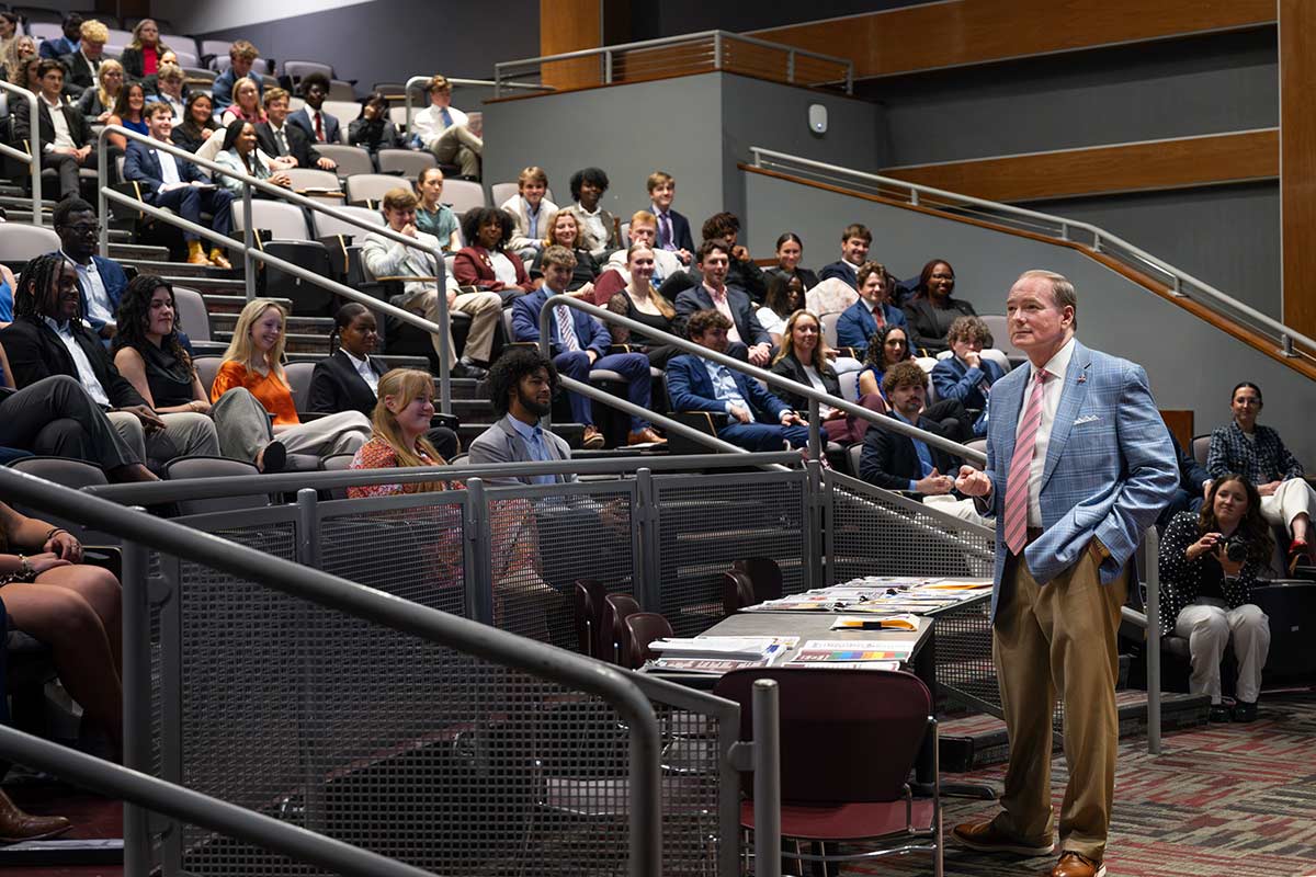 In late April, MSU President Mark E. Keenum spoke with New Maroon Camp staff at one of their meetings leading up to the event in August that welcomes new students to the Bulldog family. The group leads first-year and transfer students as they learn MSU history and traditions, discover opportunities to get involved, and meet other students.