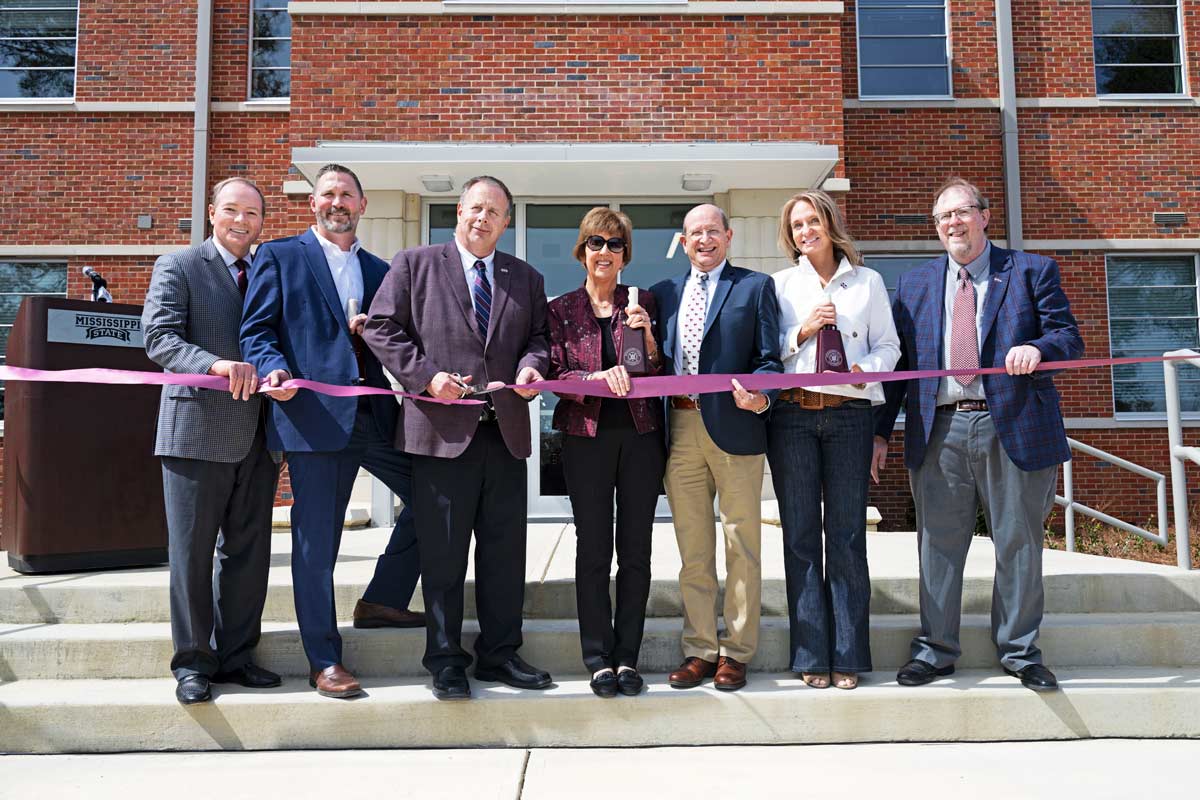 In early March, MSU celebrated the renovation of Ballew Hall with a ribbon-cutting ceremony. MSU President Mark E. Keenum, left, was in attendance alongside Clayton Davis, Southern AgCredit vice president of operations; Scott Willard, MSU College of Agriculture and Life Sciences dean and Mississippi Agricultural and Forestry Experiment Station director; Susanne Boyd Purvis and David Purvis; Martha Robertson; and Keith Coble, MSU vice president for the Division of Agriculture, Forestry and Veterinary Medicine.
