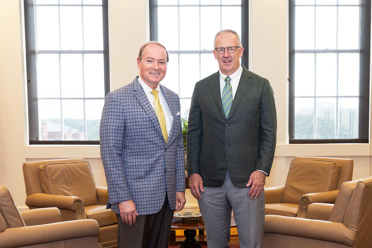MSU President Mark E. Keenum, left, hosted SEC Commissioner Greg Sankey on campus in November as the guest lecturer for Keenum’s leadership class. In his 10th year as the conference’s chief executive, Sankey’s daughter Hannah is a 2015 MSU magna cum laude graduate.