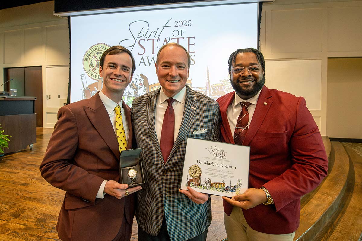 In a surprise presentation, MSU President Mark E. Keenum was recognized for his unwavering support of Mississippi State students with a special service award during the 20th annual Spirit of State recognition ceremony in April. Presented by student Hayden Cherry, left, and Assistant Director of Fraternity and Sorority Life Roderick Davis, the Spirit of State awards formally honors students who have excelled in campus involvement, service to the university, and impact on the campus community.