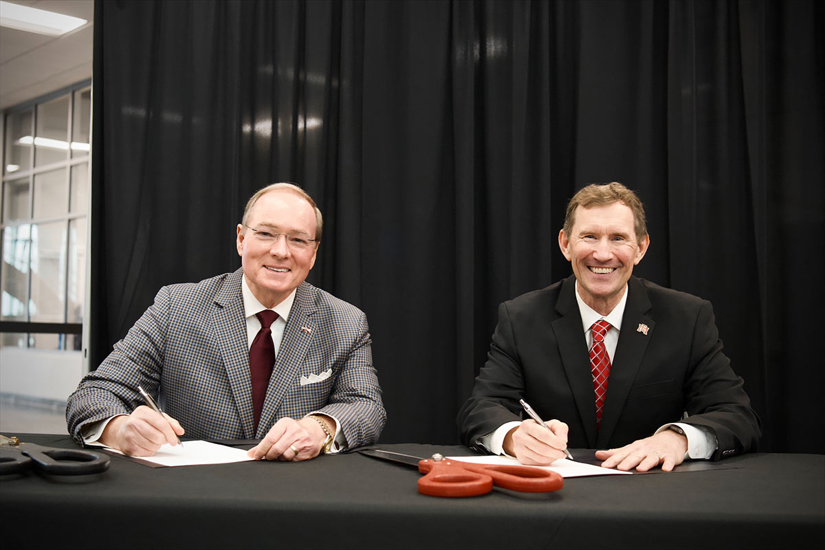 Mississippi State University President Mark E. Keenum, left, and East Mississippi Community College President Scott Alsobrooks signed an MOU and cut the ribbon in January formalizing the MSU at the Communiversity partnership through the Advancements in Manufacturing Upskilling Program, better known as AiM UP. This partnership provides workforce training for industry both inside the Golden Triangle and across the state.