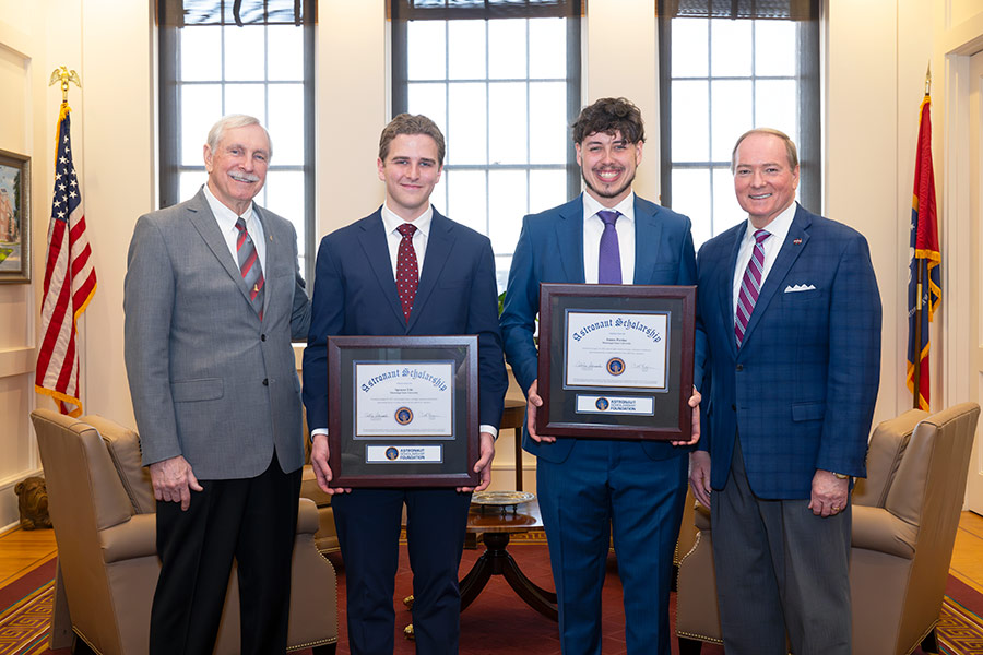 Curt Brown, left, retired U.S. Air Force colonel and six-time space shuttle veteran, visited MSU President Mark E. Keenum’s office in March to help celebrate the university’s Astronaut Scholars Spencer Lile, second from left, and James “Brittin” Perdue. The NASA astronauts continue to support the Astronaut Scholarship Foundation’s mission of STEM education and networking, awarding over $10 million to more than 900 students since its 1984 inception.