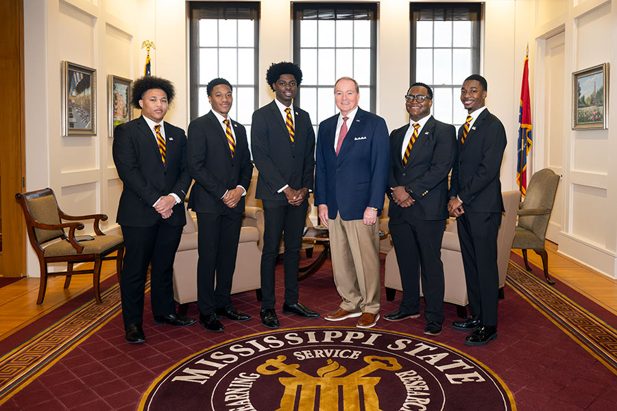 MSU President Mark E. Keenum welcomed student directors of the Men of Excellence organization to his office in February for a talk about the group’s campus and community efforts. One of the goals of MOX is to network with and learn from leaders and professionals in the education and business communities. MOX directors in attendance were, from left, Adonis Dixon, education; Rasul Bashir, programming; Matthew Gray, outreach; Quentin McCaleb, committees; and Jayden Stephen, administration.